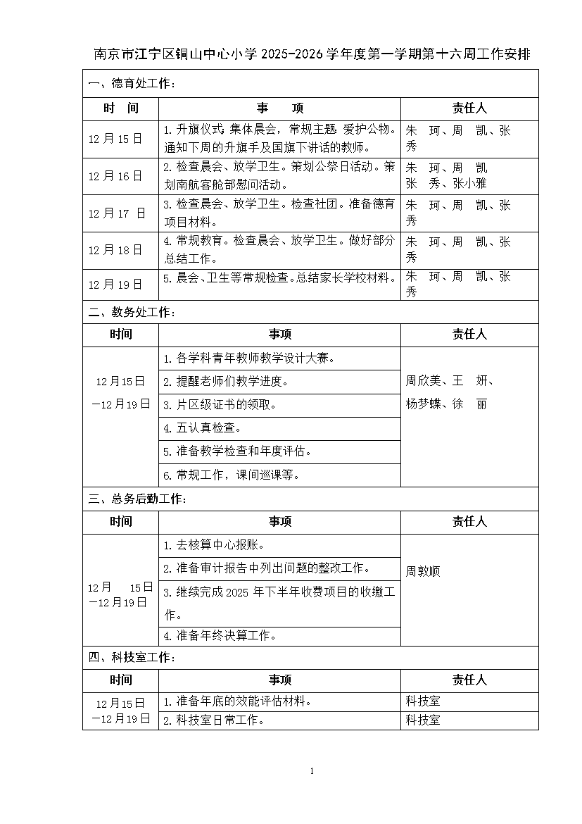 南京市江宁区铜山中心小学2025-2026学年度第一学期第十六周工作安排