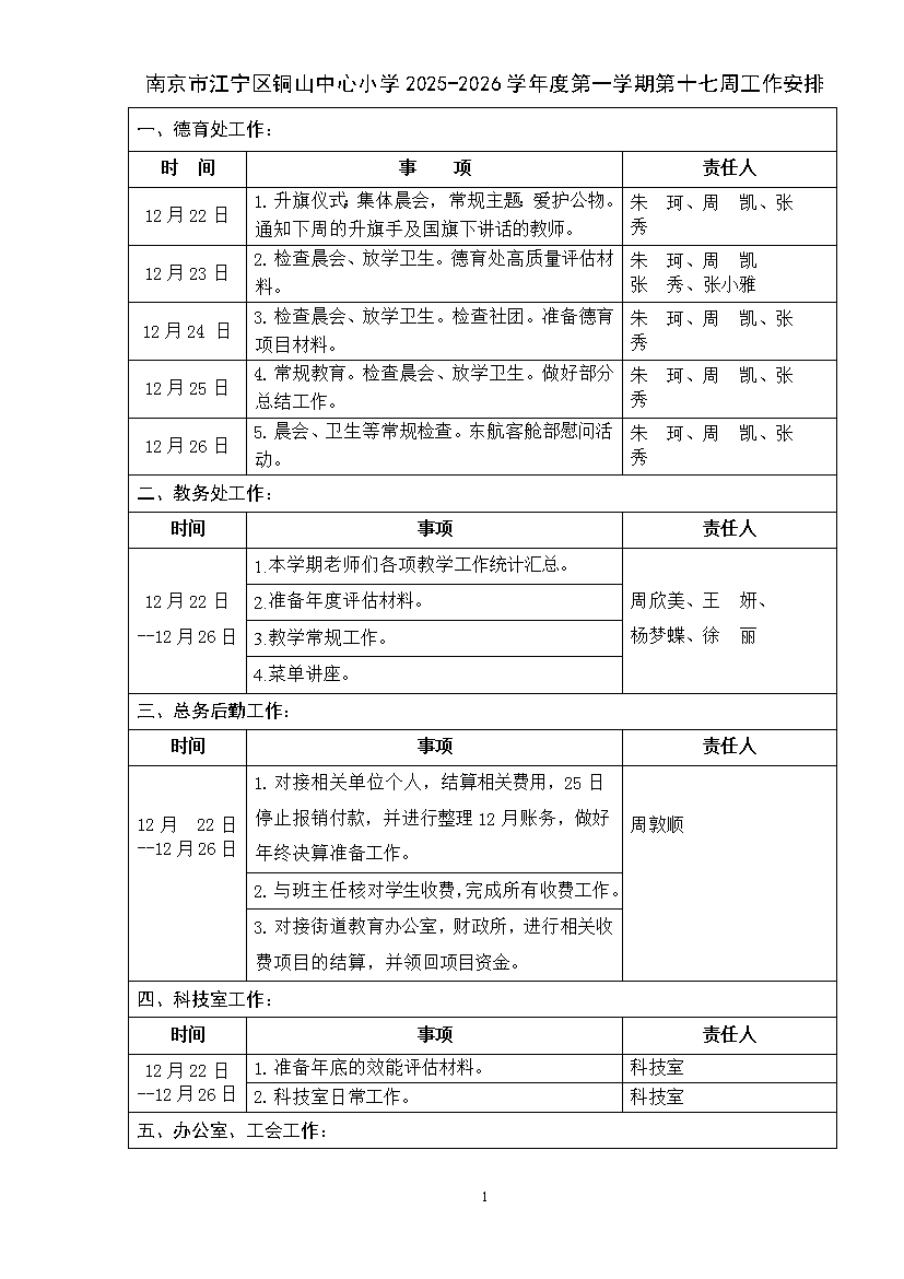 南京市江宁区铜山中心小学2025-2026学年度第一学期第十七周工作安排