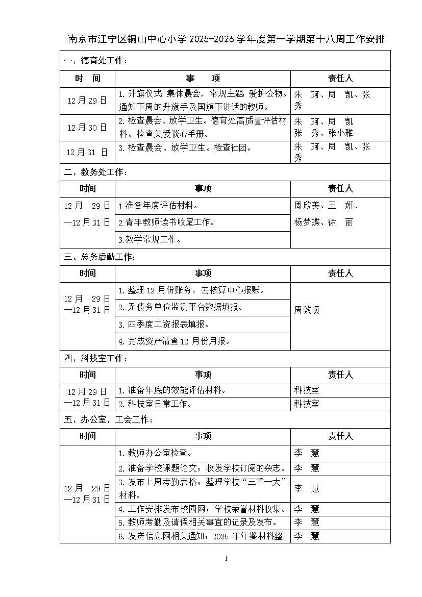 南京市江宁区铜山中心小学2025-2026学年度第一学期第十八周工作安排