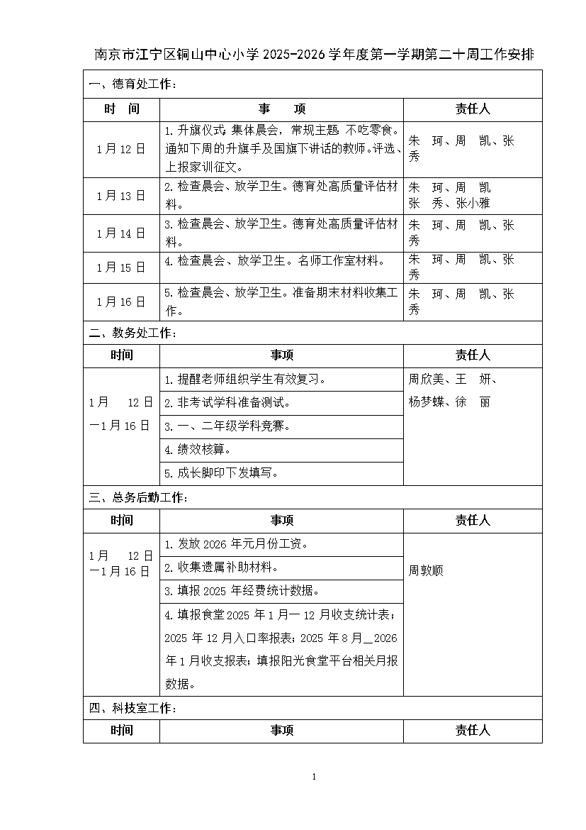 南京市江宁区铜山中心小学2025-2026学年度第一学期第二十周工作安排